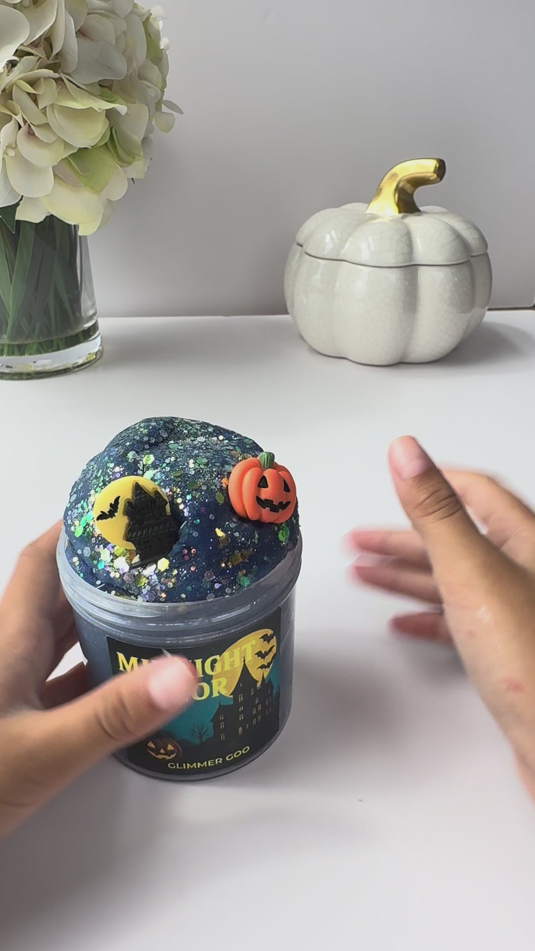 Topped with glowing yellow glitter that shines in the dark, plus a haunted mansion charm and a grinning jack-o’-lantern, this slime is the perfect mix of spooky and magical. Midnight Manor brings the chills and thrills of Halloween right to your fingertips.